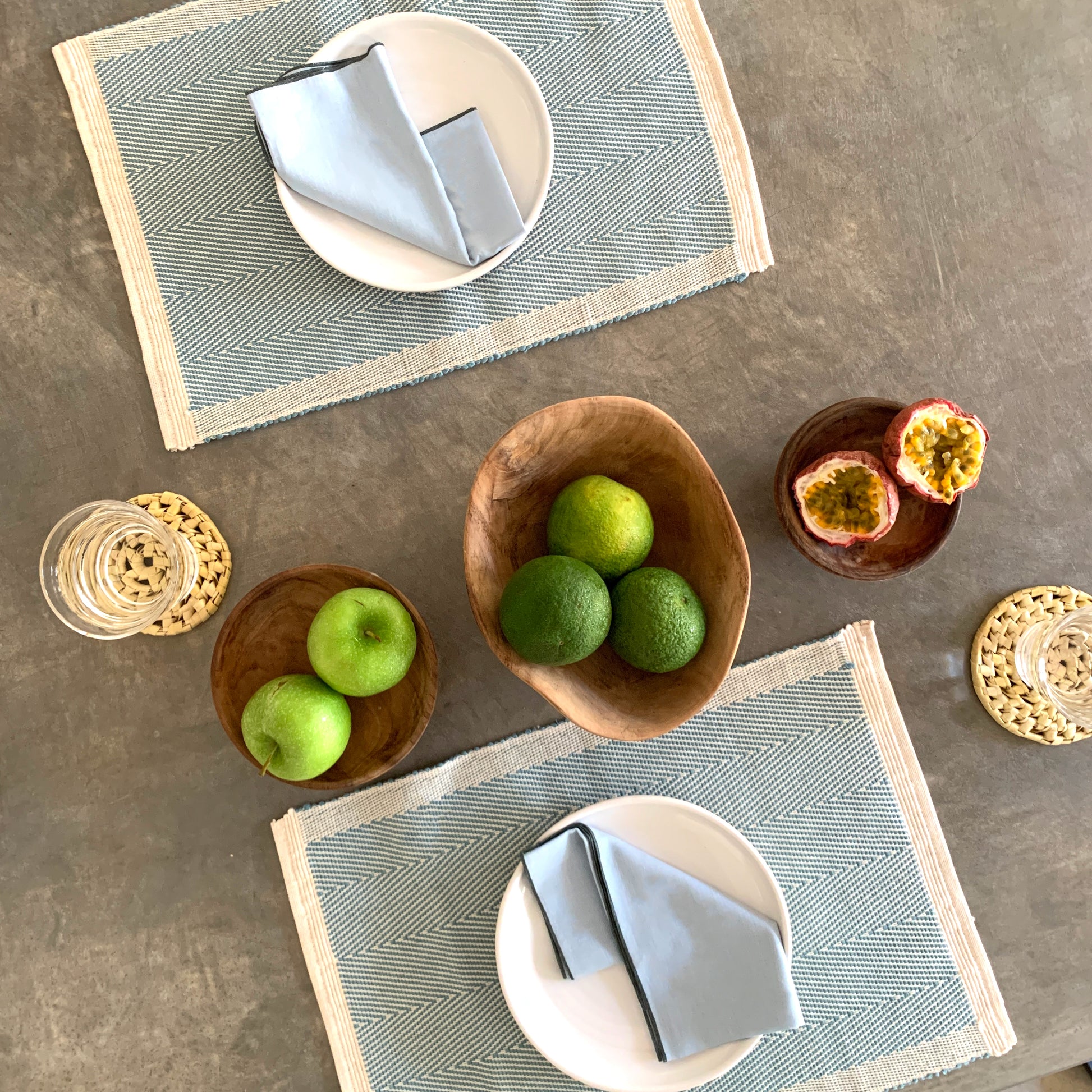 Our place mats are hand woven in chunky cotton in a muted dual colour herringbone pattern that feature a gentle tonal border and edge. A stylish and simple design for everyday use or for casual dining.