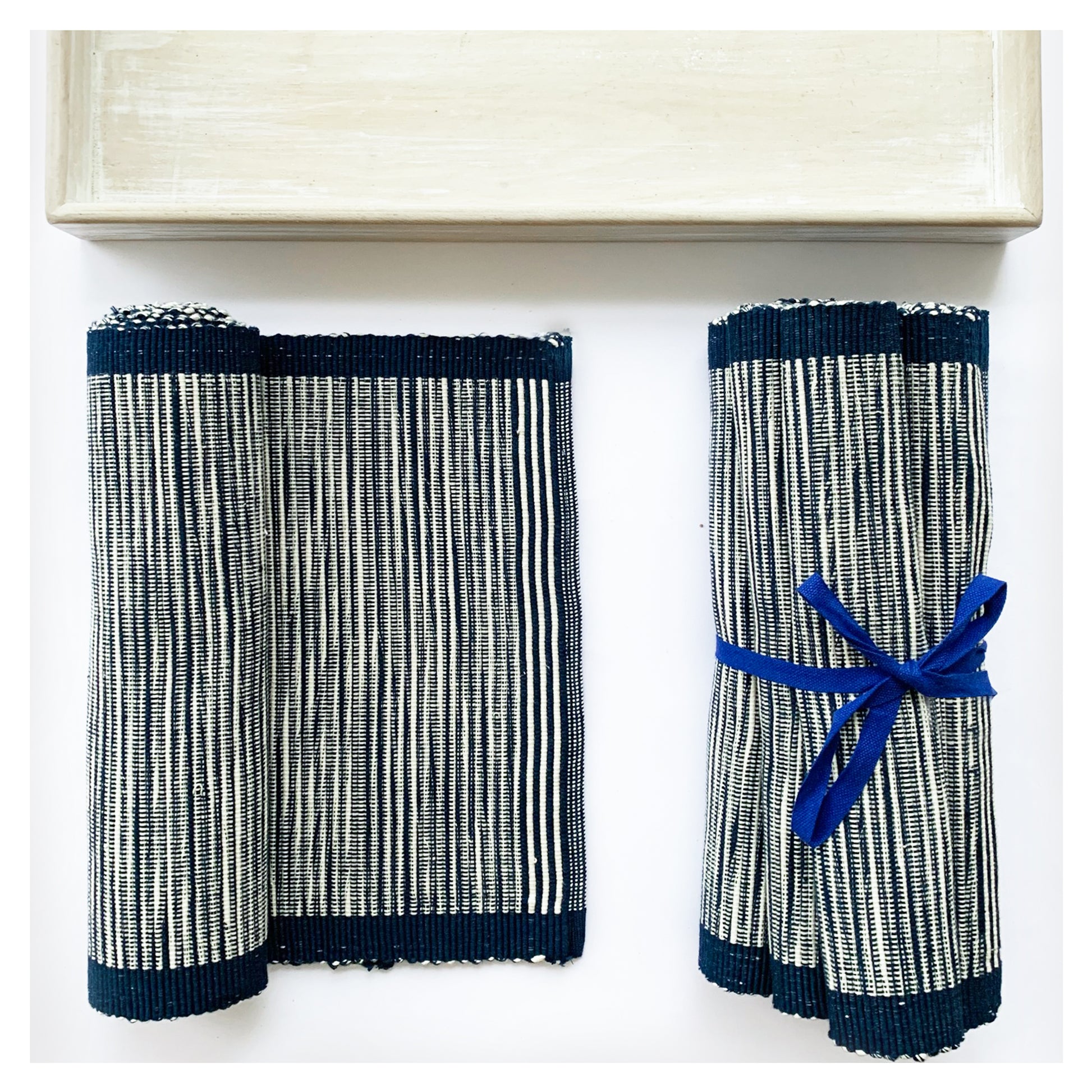 6 x Artisanal Handloom Table Mat Shadow Pearl White & Navy Ink