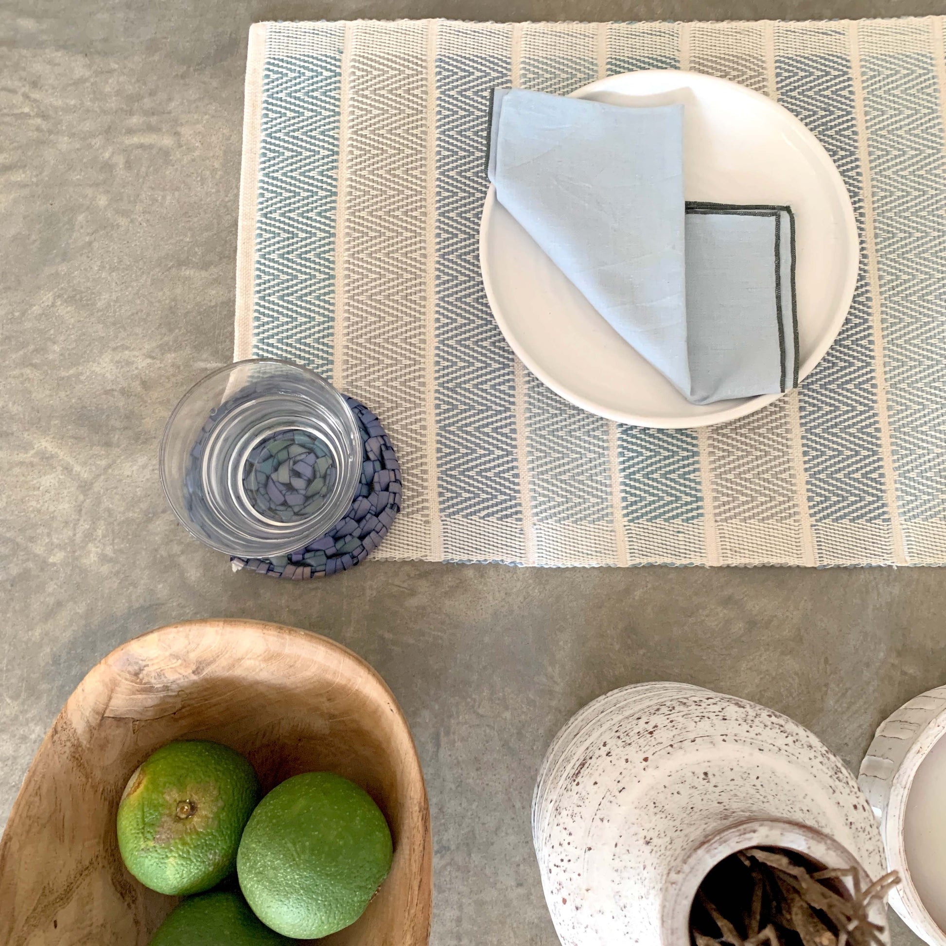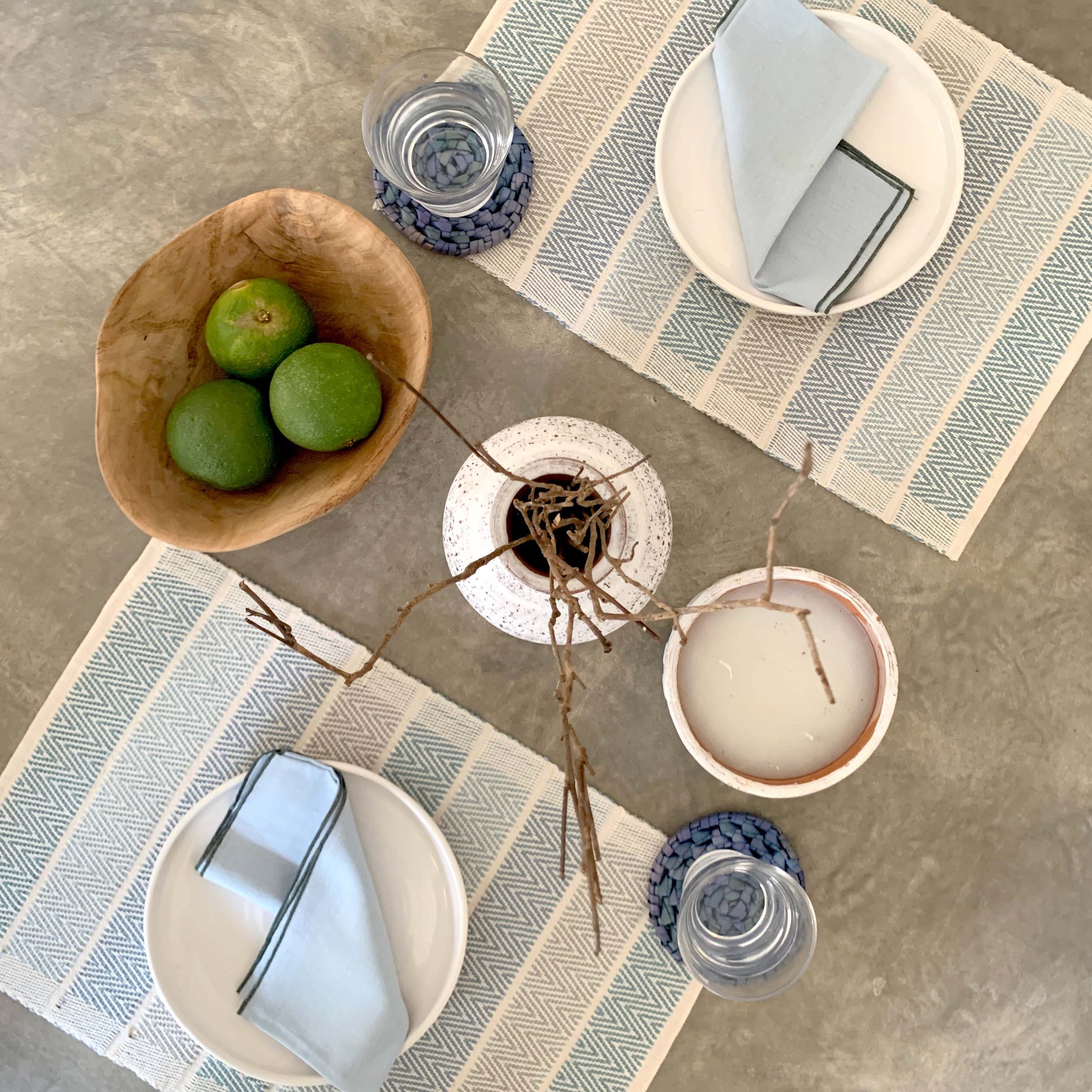 Our place mats are hand woven in chunky cotton in a muted dual colour herringbone pattern that feature a gentle tonal border and edge. A stylish and simple design for everyday use or for casual dining.